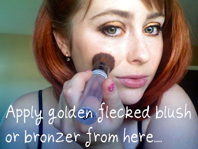 Now, choose a golden flecked blush or bronzer and sweep it from the apples of your cheeks (you can find the apple of your cheek by smiling big- the part of your cheek that pops out the most is the apple)
